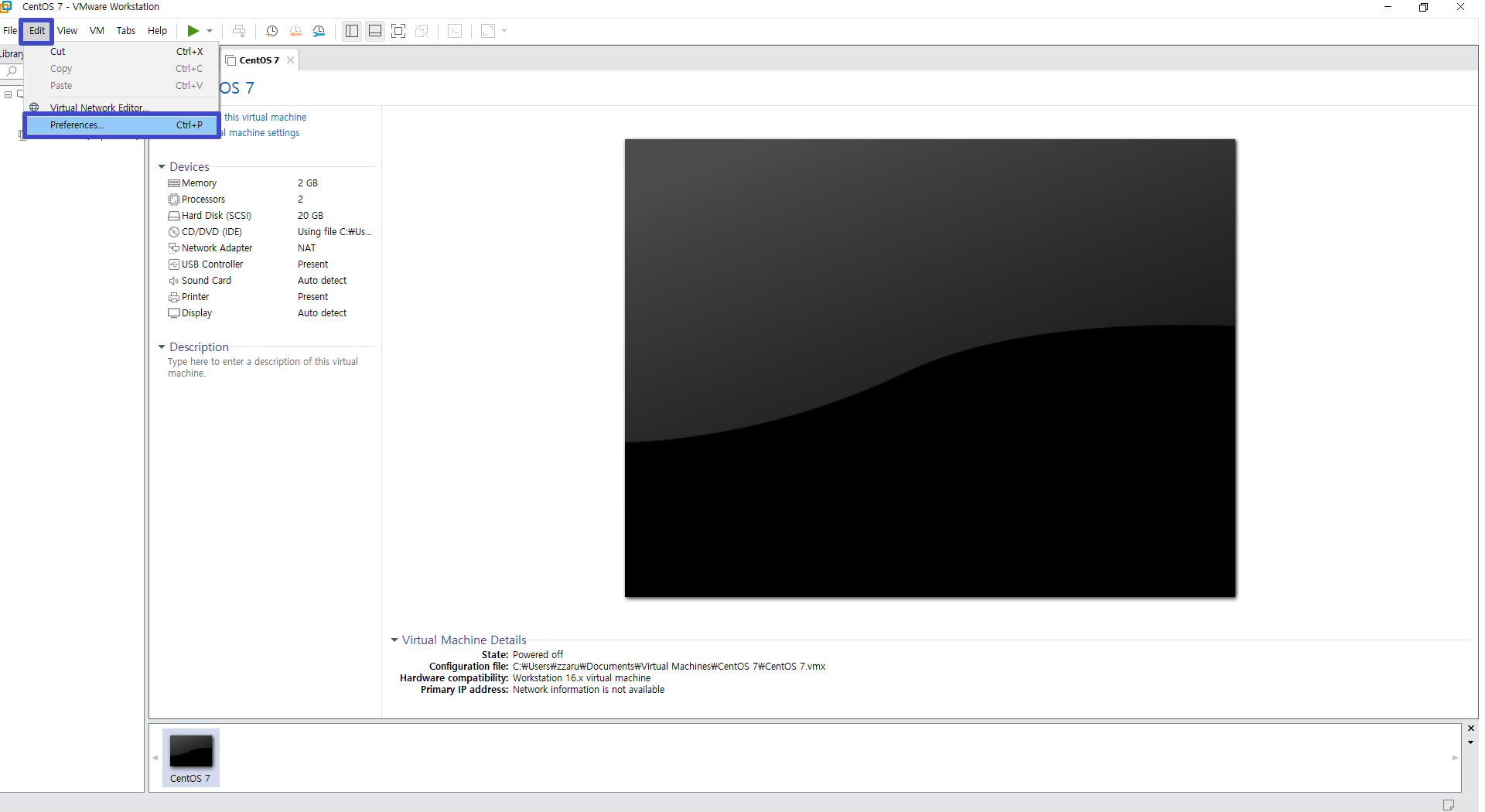 개인적으로 VMware 프로그램 화면을 빠져나가는 단축키가 불편해 설정을 변경하고 진행합니다. Edit → Preferences 메뉴를 선택하시면 됩니다.