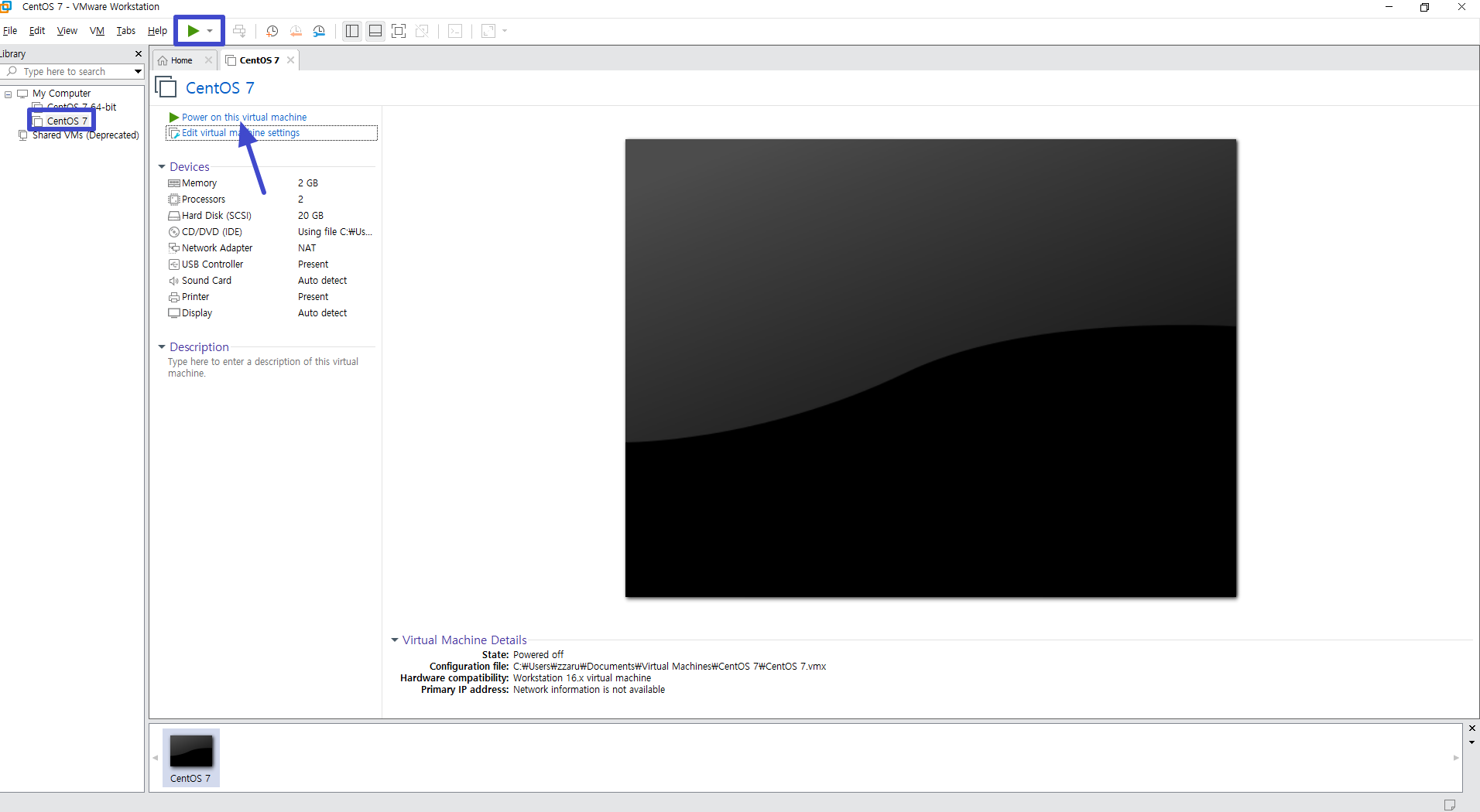 추가한 가상머신은 왼쪽 메뉴에 표시됩니다. 추가한 가상머신을 선택하시고 ▶ 버튼이나 ▶ Power on this virtual machine을 선택해 주시면 됩니다.