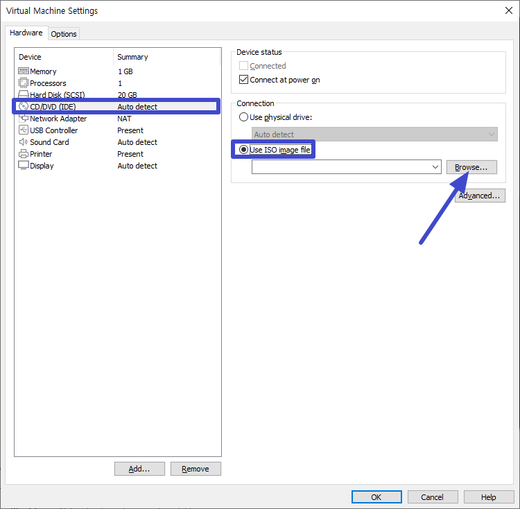 CD/DVD (IDE) 선택 Use ISO image file 체크 후 Browse.. 버튼을 선택하시면 됩니다.
