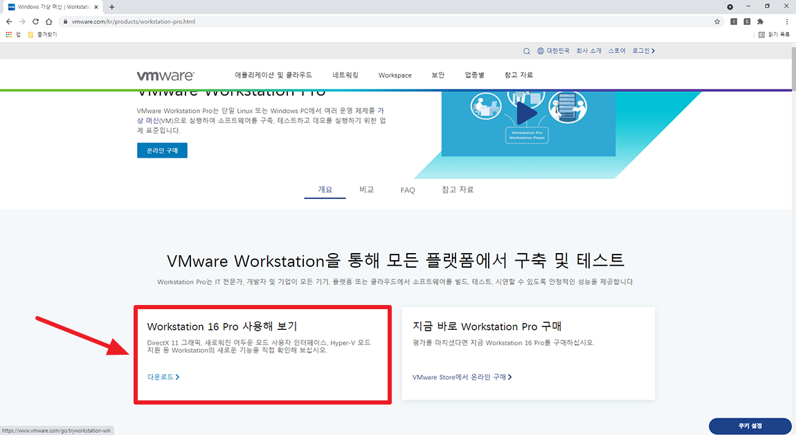 페이지 중간에 Workstation 16 Pro 사용해 보기 선택.
