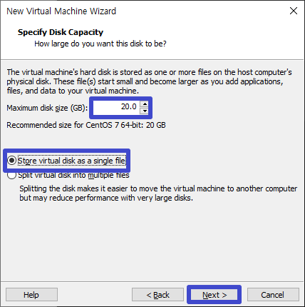 연습용으로 하는 것이기에 디스크 용량은 20.0 GB를 선택하였으며 Store virtual disk as a single file 선택 후 Next.