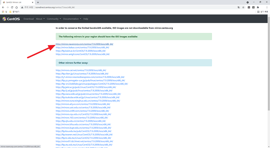 파일 목록 중 CentOS7 버전의 iso 링크를 선택하시면 됩니다. 그럼 ISO 파일이 다운로드 되게 되는데 정상적으로 다운되지 않거나 다운로드 파일 경로를 못 찾으셨다면 http://mirror.navercorp.com/centos/7.9.2009/isos/x86_64/CentOS-7-x86_64-DVD-2009.iso 주소를 인터넷 주소에 붙여 넣고 엔터를 누르시면 CentOS 7 ISO 파일을 바로 다운로드하실 수 있으니 참고하시면 좋을 것 같습니다.