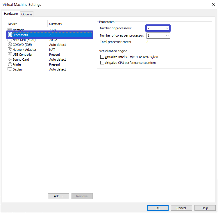 가상 머신 추가 과정에서 설정을 진행하셨다면 Finish를 누르시면 되고 가상머신 추가 이후에 설정을 하셨다면 OK 버튼을 누르게 되면 추가 설정은 모두 완료됩니다.