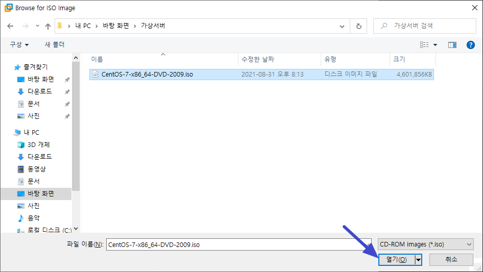 다운로드했던 CentOS 7 iso 파일을 선택하시고 열기. 후 OK.