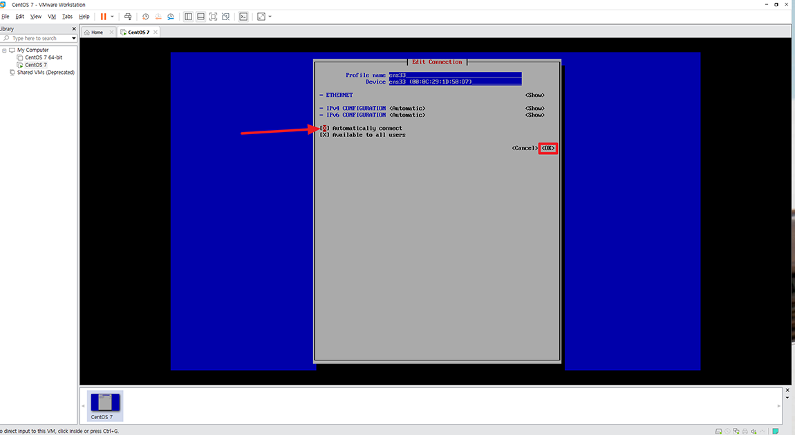 Automatically connect 메뉴에서 스페이스바를 누르시면 X가 활성화됩니다. 자동 연결을 활성화하시고 OK 선택.