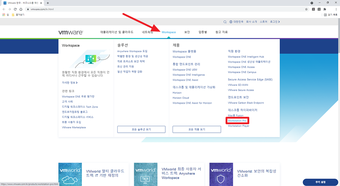 CentOS ISO 파일을 준비하셨다면 VMware 프로그램을 설치하시면 됩니다. https://www.vmware.com/ 사이트에 접속하시고 Workspace 메뉴에 WorkStation Pro를 선택하시면 됩니다. 참고로 WorkStation Pro는 유료입니다만 체험판 기간을 기본적으로 제공하니 참고하시기 바랍니다.