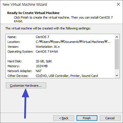 새로운 가상 머신 추가를 완료하기전 Customize Hardware..를 선택해 추가 설정을 진행 하실 수 있습니다.