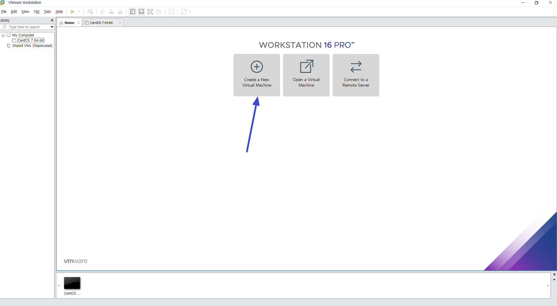 VMware workstation 메인 화면에서 Create a New Virtual Machine 선택.