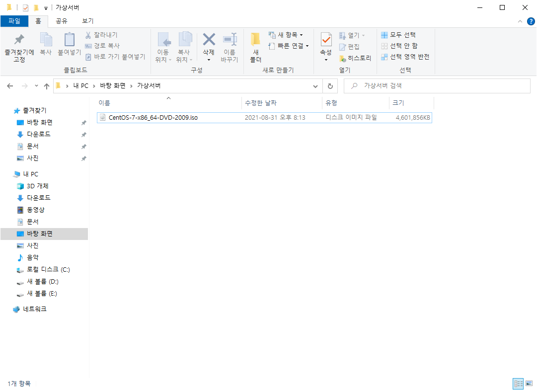CentOS 7 버전의 ISO 파일이 다운로드 완료되게 되면 아래 이미지와 같이 윈도우 환경에서 확인 가능합니다.