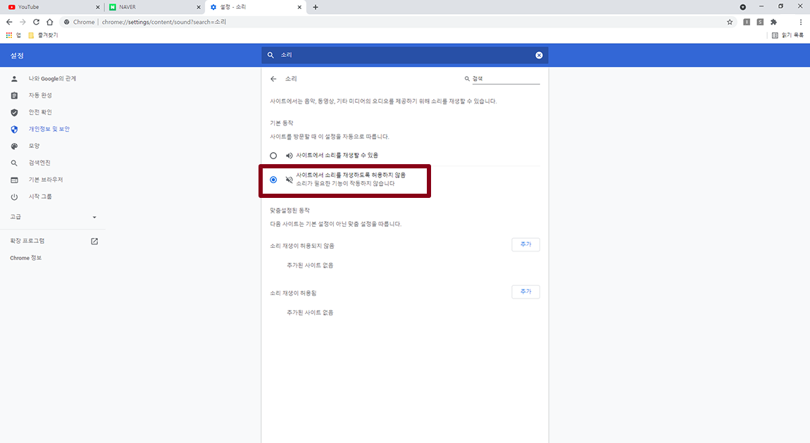 그럼 아래 이미지와 같이 크롬 브라우저의 모든 사이트 소리를 나오지 않도록 설정하시려면 사이트에서 소리를 재생하도록 허용하지 않음에 체크하시면 됩니다.