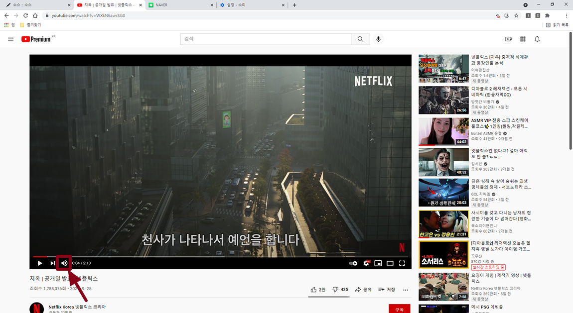 유튜브 사이트 소리 자체를 막고 PC 환경에서 유튜브 사이트에 들어가 보니 사운드는 켜져 있지만 들리는 사운드는 없네요.
