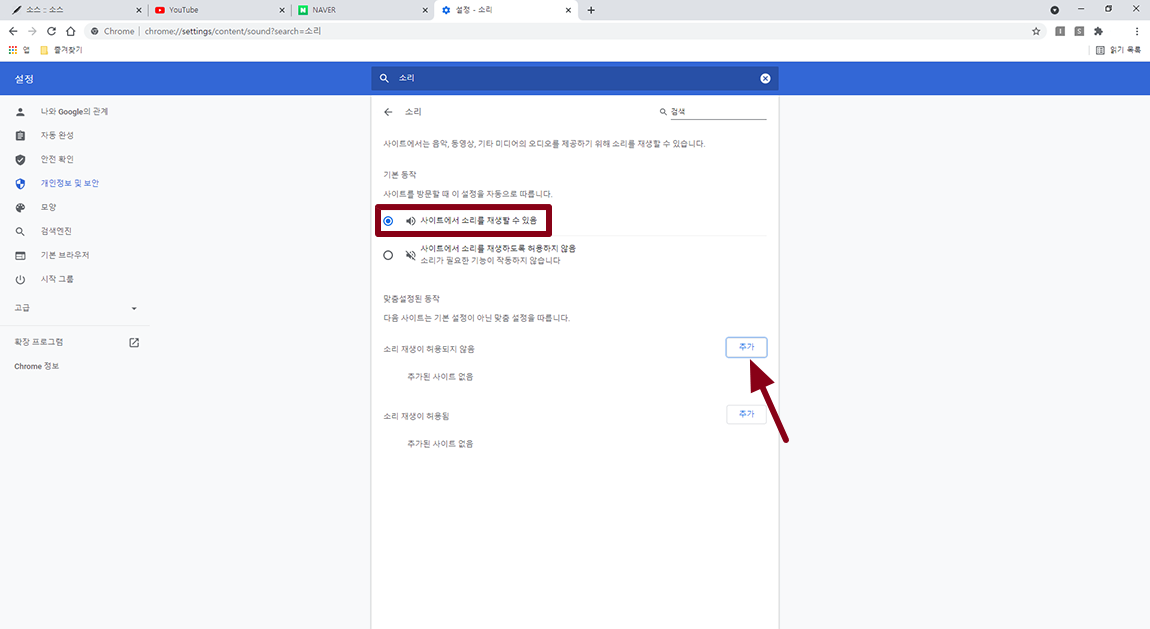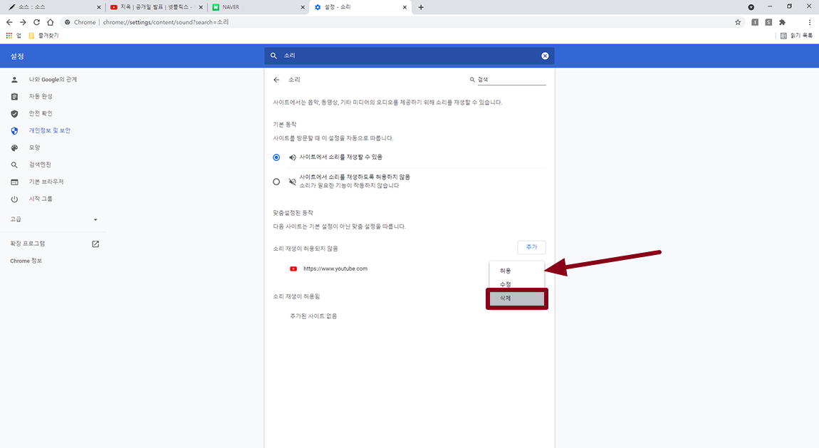 다시 특정 사이트 소리가 나오게 하시려면 추가한 사이트에서 ▶ 버튼을 선택하시고 허용 및 삭제를 하시면 됩니다.