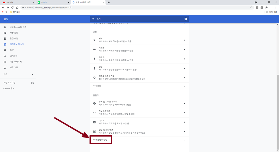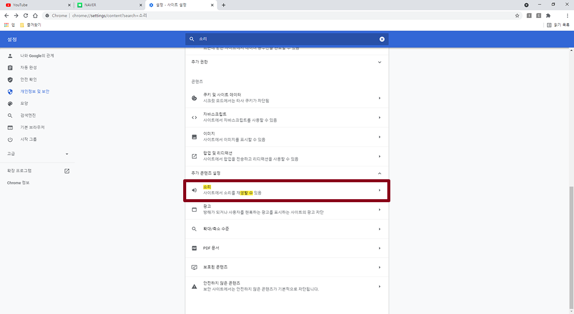 설정 메뉴에서 검색을 이용하시면 편합니다. 소리를 검색하시면 여러 가지 메뉴가 나오는데 여기서 사이트 설정 메뉴 선택.