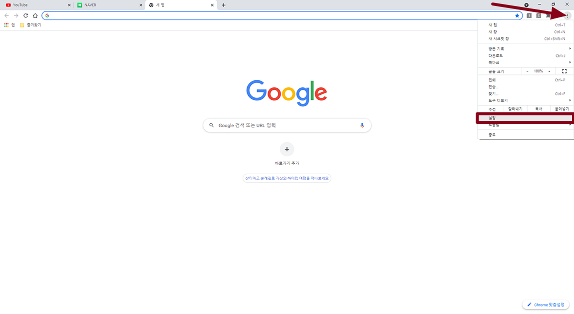 크롬 브라우저를 실행 하시고 점3개로 표시된 메뉴 버튼을 선택하시고 설정 메뉴 선택.