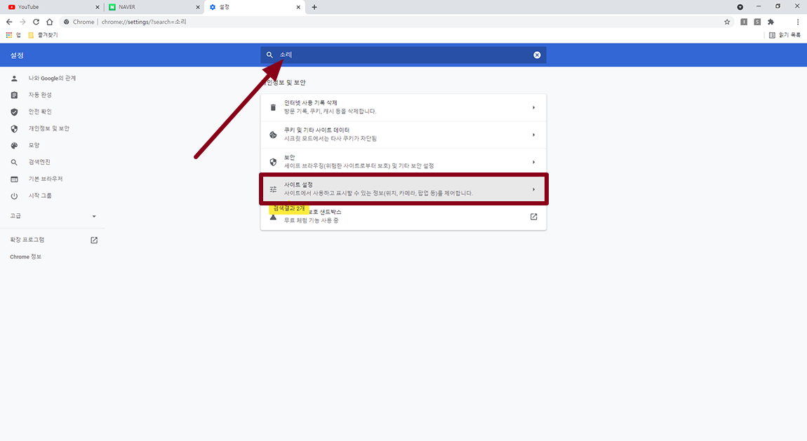 설정 메뉴에서 검색을 이용하시면 편합니다. 소리를 검색하시면 여러 가지 메뉴가 나오는데 여기서 사이트 설정 메뉴 선택.