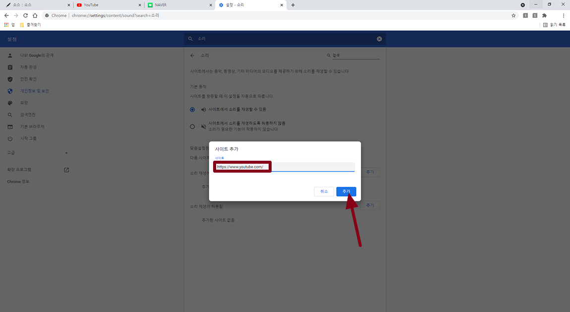 다시 특정 사이트 소리가 나오게 하시려면 추가한 사이트에서 ▶ 버튼을 선택하시고 허용 및 삭제를 하시면 됩니다.