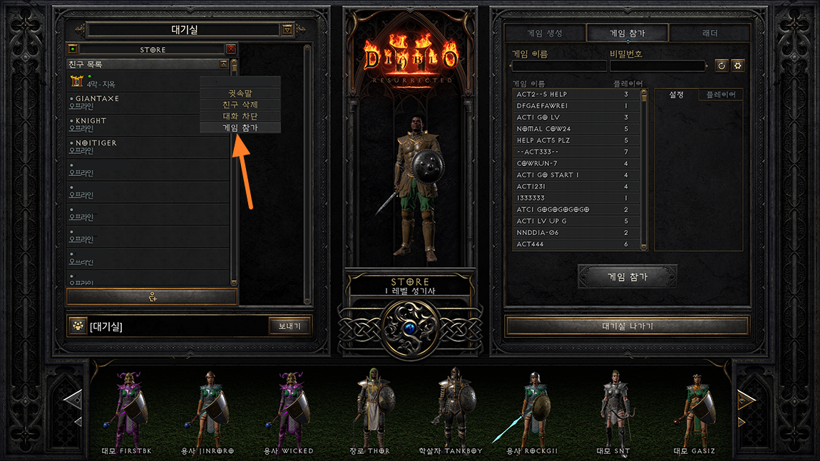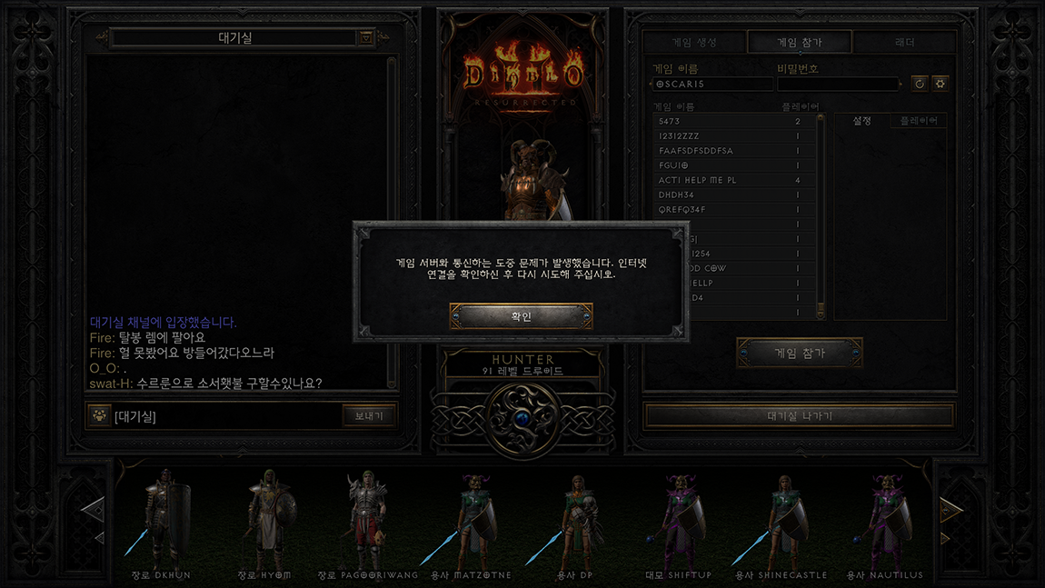 디아2 방을 만들 때 서버 부하를 위해 잠시 기다리면 풀리는 경우는 게임참가에 표시된 방 목록이나 개인적으로 방을 만들어서 게임을 하는 것은 진행은 됐습니다.
