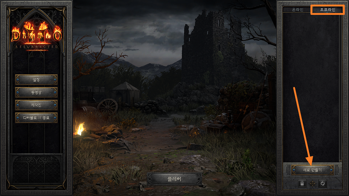 상단 오른쪽에 오프라인 버튼을 선택하시고 새로 만들기 버튼으로 싱글 플레이 캐릭터 생성.