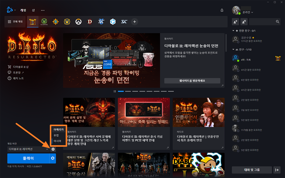 먼저 배틀넷 앱에서 기존에 오류가 발생했던 서버인 아시아 서버가 아니라 유럽이나 아메리카 서버를 선택하시고 플레이 선택. 저는 서버를 바꾸는 것만으로는 해결되지 않았습니다.