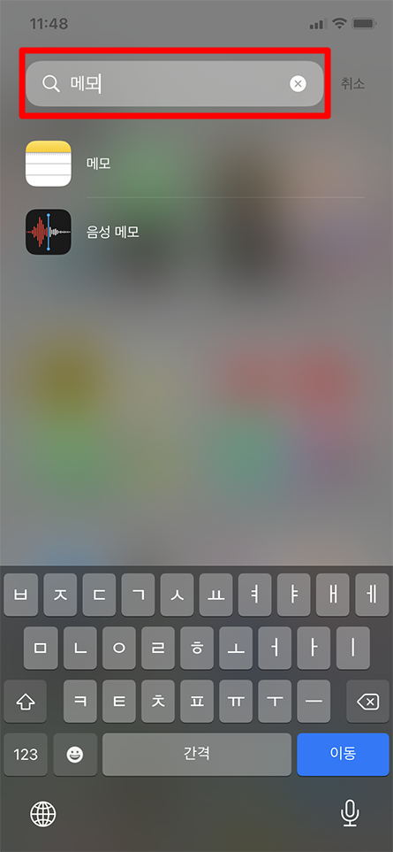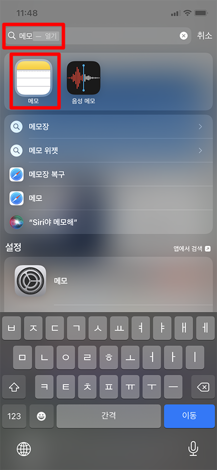 자주 안 쓰는 아이폰 메모 앱은 꼭 찾으려고 하면 잘 안 보이더라고요. 어쨌든 이곳에서 검색해서 키보드에 이동을 눌러도 메모 앱이 바로 열립니다.