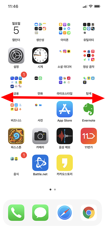 아이폰 앱을 찾으실 땐 현재 화면이 왼쪽 끝으로 가는 게 가까운지 오른쪽 끝으로 가는 게 가까운지 판단하셔서 활용하시면 원하는 앱을 좀 더 빠르게 찾으실 수 있습니다.