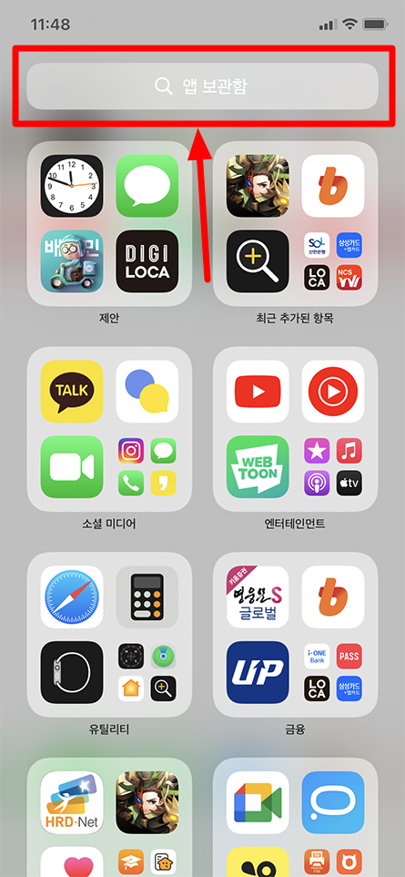 아이폰 화면에서 오른쪽으로 쭉 이동해도 앱 보관함 기능에서 설치된 앱을 검색해서 찾으실 수 있습니다.
