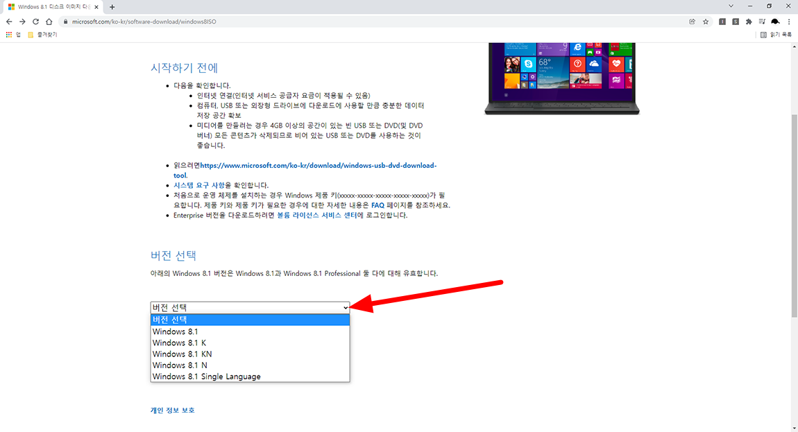 먼저 마이크로소프트 공식 홈페이지 링크로 가시면 됩니다. - https://www.microsoft.com/ko-kr/software-download/windows8ISO