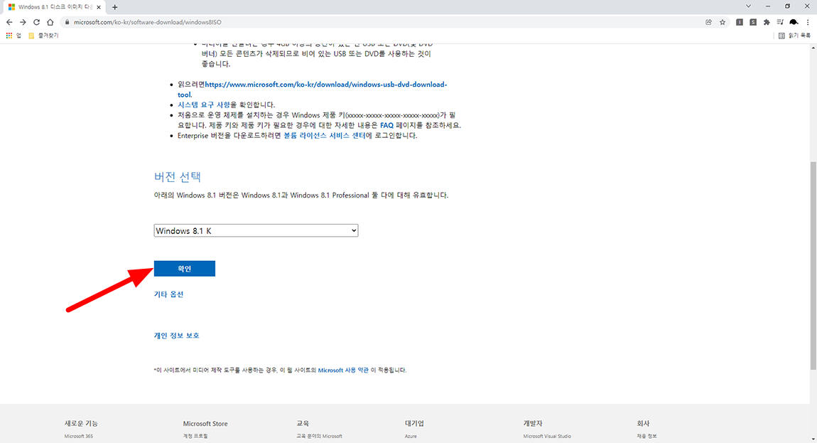저는 Windows 8.1 K 버전을 선택하였고 확인 버튼을 누르시면 됩니다.