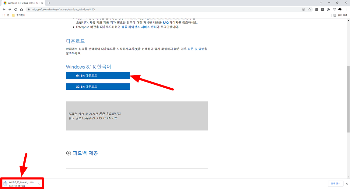 마지막으로 자신의 PC, 노트북 환경에 따라 운영체제를 선택하시면 됩니다. 저는 64-bit 다운로드를 선택했습니다. 그럼 ISO 파일 다운로드가 시작되게 됩니다.