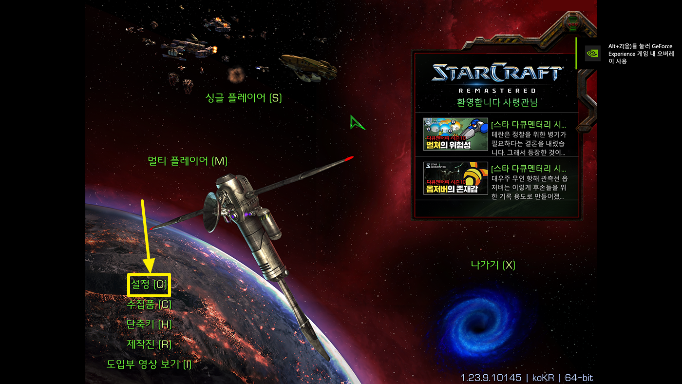 스타크래프트 리마스터 멀티플레이어를 들어가기 전 설정 메뉴를 이용하셔도 됩니다. 왼쪽 하단에 설정 메뉴 선택.