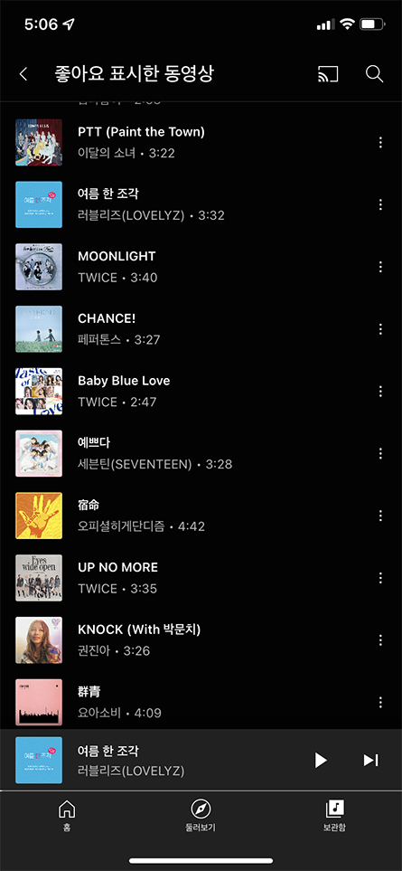 밖에 외출할 땐 음악 애플리케이션은 저에게 필수입니다. 예전엔 다른 뮤직 앱을 주로 사용했으나 유튜브에 방대한 노래는 데이터를 사용하지 않고도 노래를 들을 수 있는 오프라인 저장 기능 때문에 주로 사용하게 된 뮤직 앱입니다.