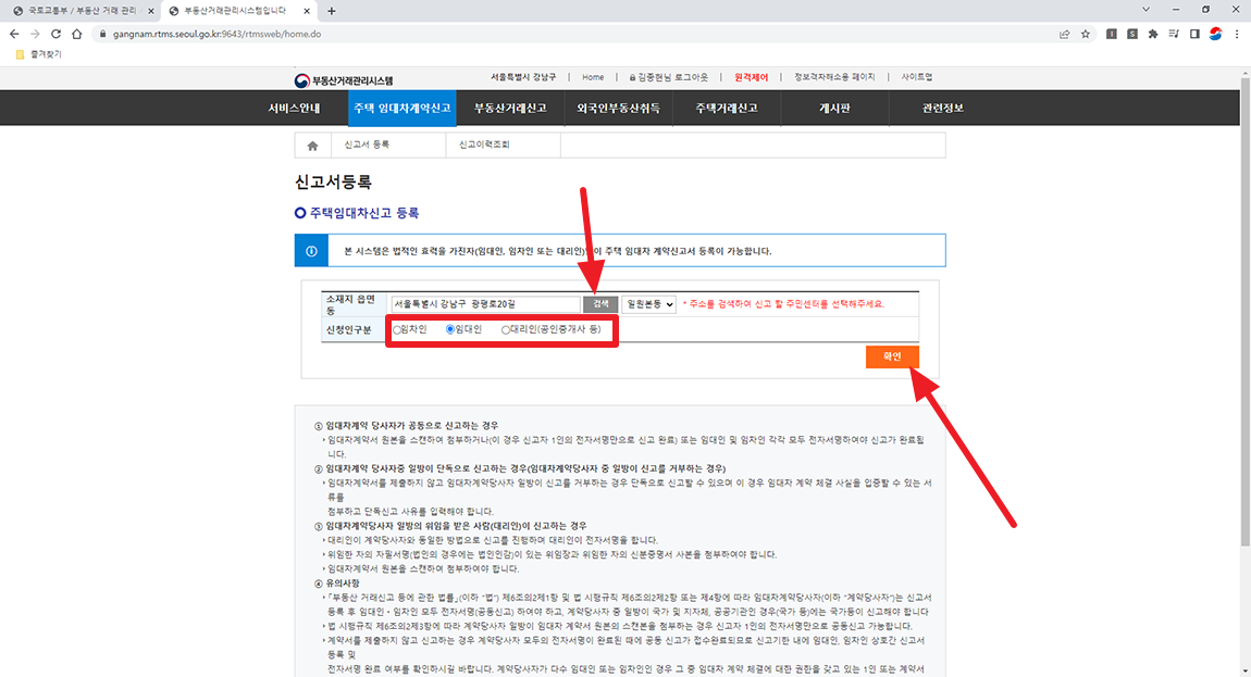 그럼 아래 이미지와 같이 신고서등록 절차에 필요한 해당 부동산의 주소를 물어보게 됩니다. 검색 버튼을 눌러 다시 한번 계약하는 부동산 주소를 선택하시고 신청인 구분에 임대인으로 선택 후 확인 버튼 누르시면 됩니다.