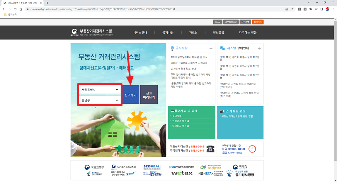 결과적으로 임대인인 제가 직접 주택임대차 신고를 인터넷으로 진행해 봤습니다. https://rtms.molit.go.kr/index.do 국토교통부 사이트에 접속 후 계약하는 부동산 지역을 선택하시고 신고하기를 누르시면 됩니다.