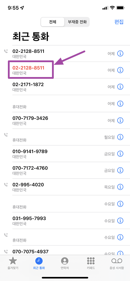 저는 아이폰 XR을 사용하고 있습니다. 아이폰 통화 내역에 있는 번호를 복사하는 방법에 대해서 간단히 정리해 보려고 합니다. 먼저 아래 이미지와 같이 전화번호 모양 아이콘 선택.