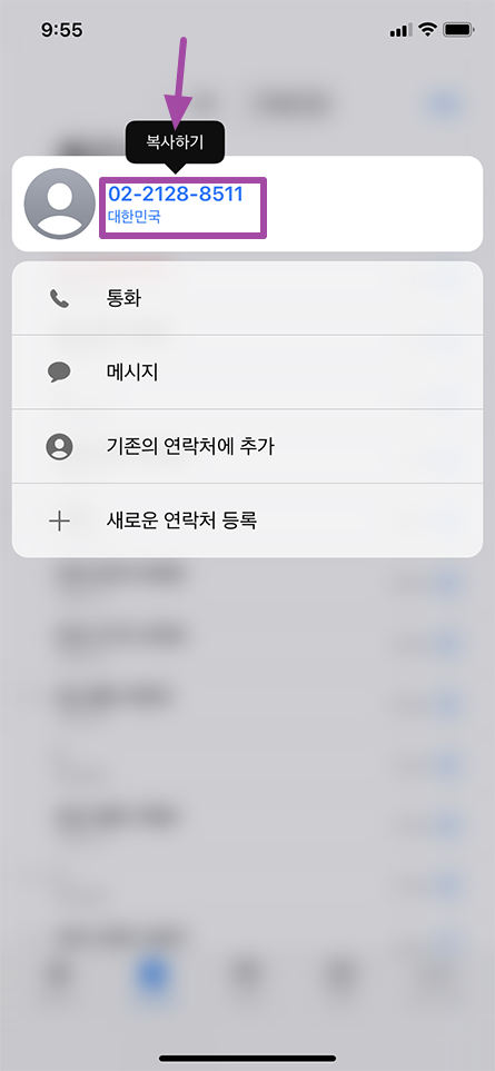 번호가 표시된 부분을 터치하고 계시면 아래 이미지와 복사하기 팝업이 표시되며 번호를 복사하실 수 있습니다.