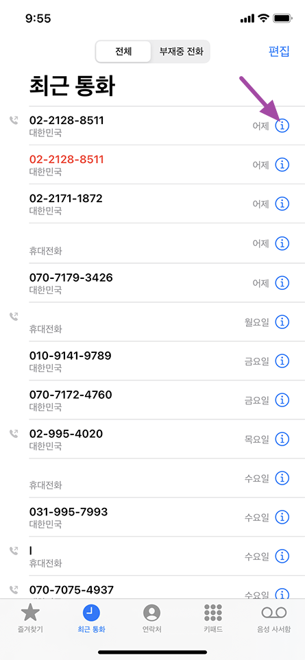 저야 대부분 스팸 전화이기 때문에 상관없지만, 번호를 복사하려고 누르고 있다 보면 바로 통화로 연결되는 경우가 있습니다. 이럴 때 번호 복사를 안전하게 하는 방법이 있습니다. 파란색 i를 누르시면 됩니다.