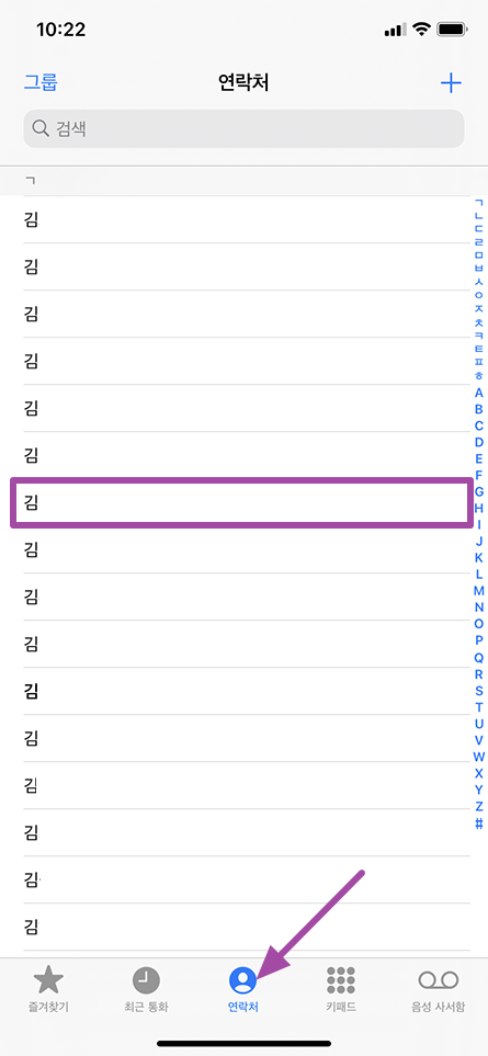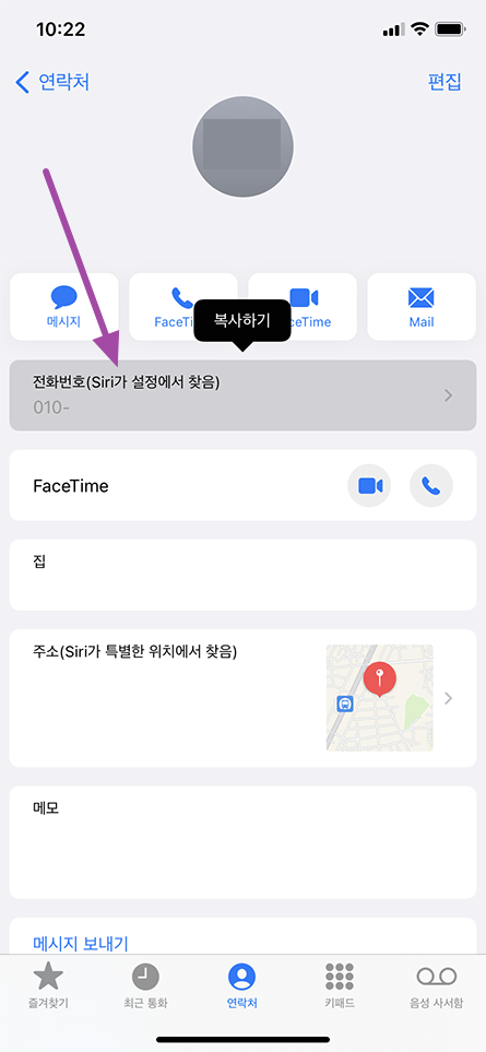 마찬가지로 연락처에 있는 전화번호를 복사하고 싶으시다면 연락처 목록 중 하나를 선택하시면 상세정보가 나오게 됩니다.