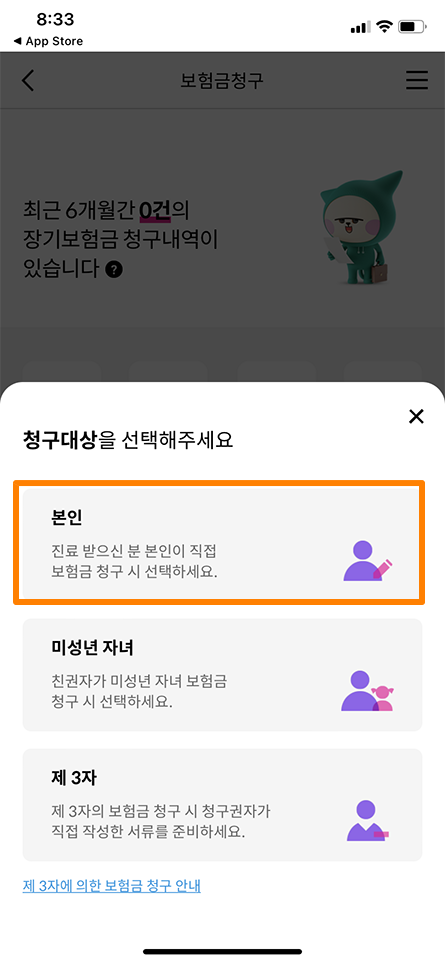처음 본인 인증 과정만 안내에 따라 잘 진행해 주시면 됩니다. 본인 인증 과정을 완료하시고 보험금청구 메뉴 선택.