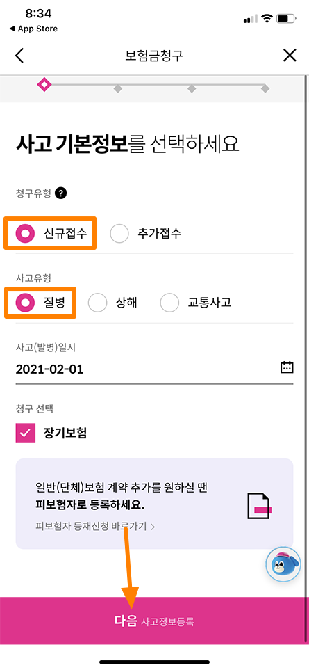 보험금청구 메뉴를 고르면 되는데 PC 버전보다 메뉴가 간소화 되어 있어 편합니다. 신청하려는 보험금의 시작 날짜를 선택 후 신규 접수, 질병 선택 후 다음 선택.