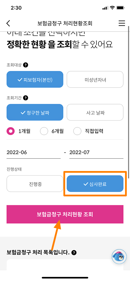 저는 이미 심사가 완료되어 보험금을 지급받았기에 심사 완료에 체크하였지만, 아직 처리 중이시라면 진행 중을 선택하고 보험금청구 처리현황 조회를 눌러 주시면 됩니다.