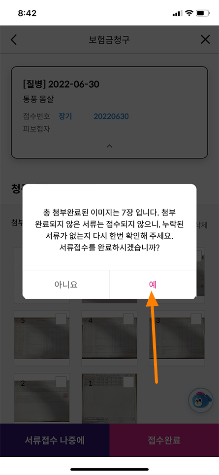 보험금 접수가 드디어 모두 완료되었습니다. 확인 버튼 눌러 주시면 됩니다.
