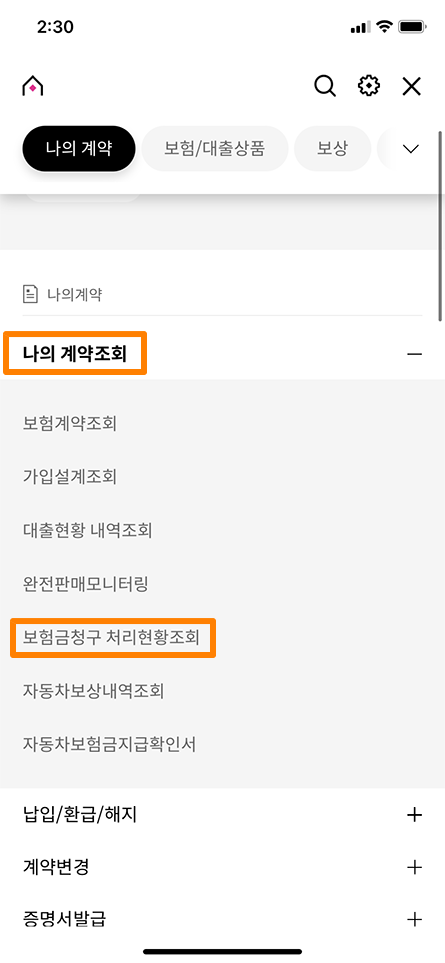나의 계약조회 메뉴에서 보험금청구 처리현황조회 선택.