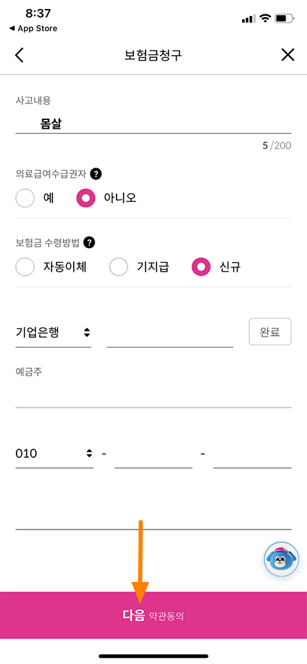 병원과 약국에서 진료받았던 내용에 대해 간략히 작성하였으며 보험금 수령 방법을 신규로 선택하였습니다. 자동이체로 보험금을 수령하려고 하였으나 신규로 진행해도 문제없이 보험금을 입금 받았습니다.
