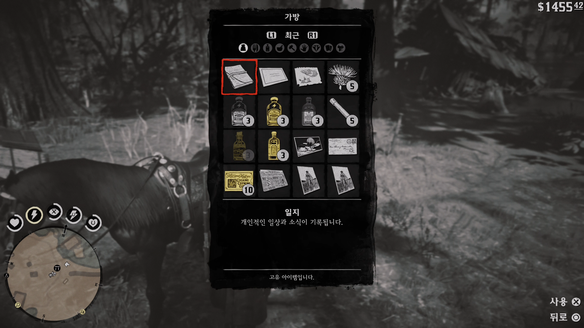 아이템 창 분위기는 레트로 향수가 강했습니다. 미국이 발전하기 전 서부 개척 시대의 배경이다 보니 아이템 창에 있는 아이템 목록도 복고풍 분위기를 느낄 수 있어 아이템 목록을 확인하는 재미도 있었습니다.