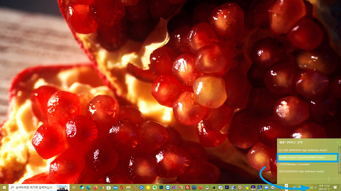플스5 컨트롤러를 PC에 연결하니 오디오 장치가 하나 늘었습니다. 저는 기존에 모니터 2대 그리고 사운드바를 사용하고 있는데 주로 사용하는 출력 장치는 Realtek Digital 장치를 통해 사운드바를 사용합니다. 그래서 PS5 컨트롤러 연결 시 스피커(Wireless Controller)로 연결되었던 장치를 Realtek Digital 장치로 변경해 주었더니 정상적으로 소리가 잘 나왔습니다.