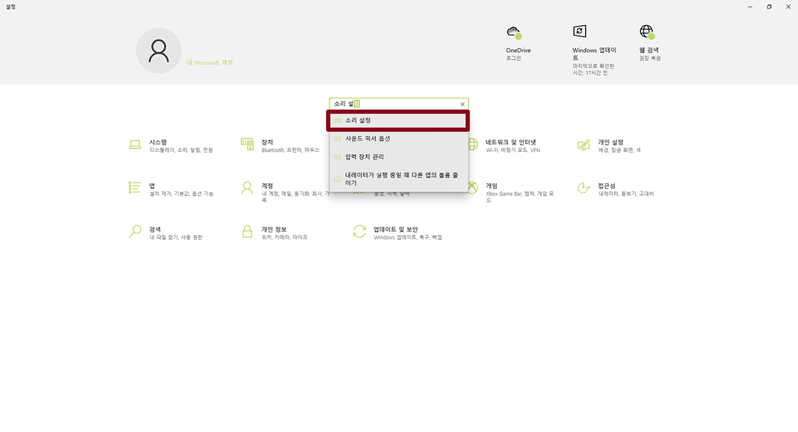 설정 메뉴 중 소리 설정 메뉴 검색 후 선택.