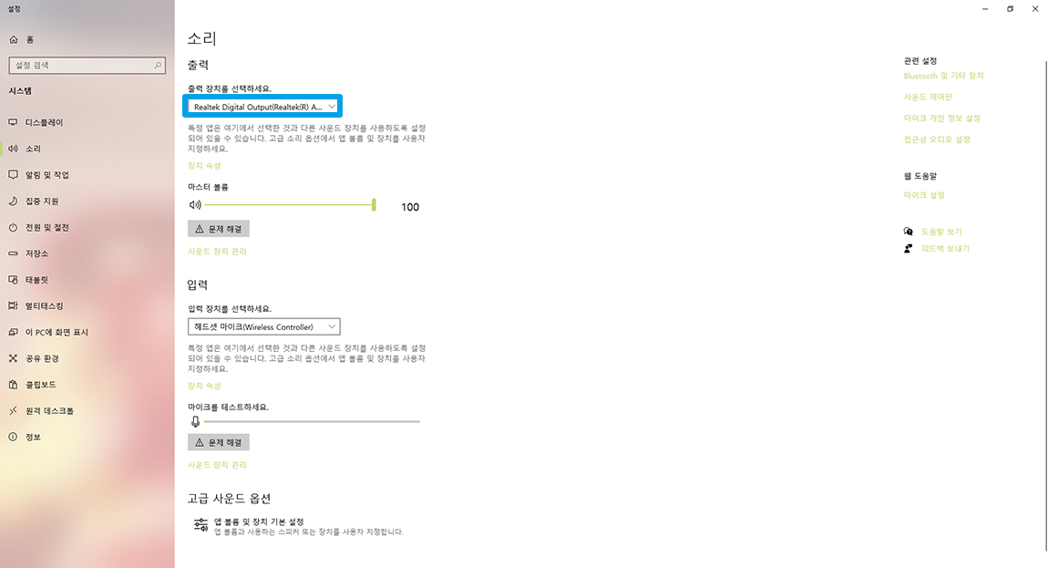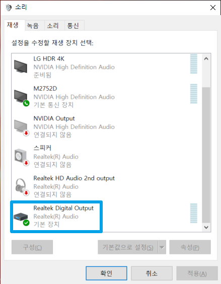 소리 출력 메뉴에 기존에 연결된 오디오 장치를 확인해 두시면 더 편합니다. 기존에 저는 Realtek Digital Output 장치에 오디오 장치가 연결되어 있었습니다.
