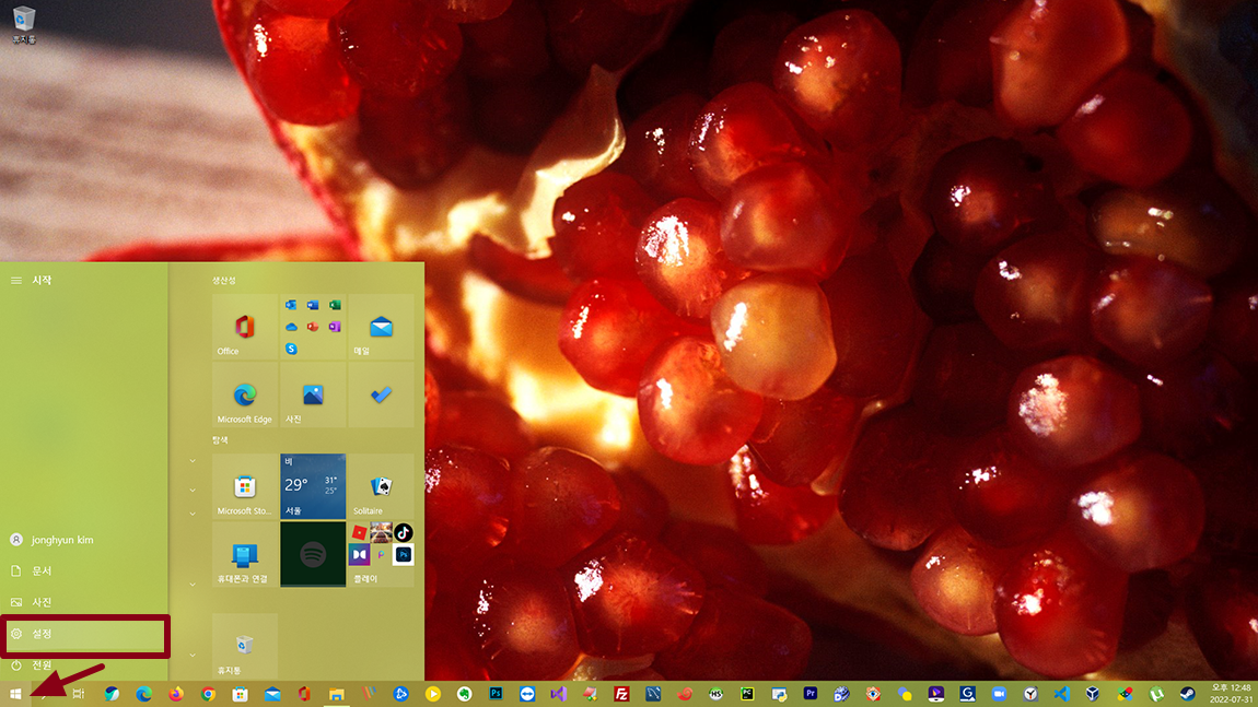 위 방법은 가장 간단한 방법이며 윈도우 설정 메뉴에서 확인하시려면 윈도우 키를 누르시고 설정 메뉴 선택.