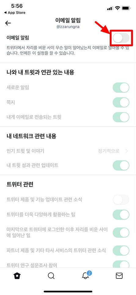 트위터에서 더 이상 메일 알림이 오지 않게 설정이 완료되었습니다.
