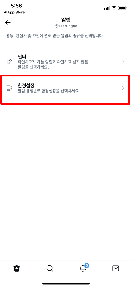 설정 메뉴에서 알림 메뉴 선택 후 환경설정 메뉴 선택.